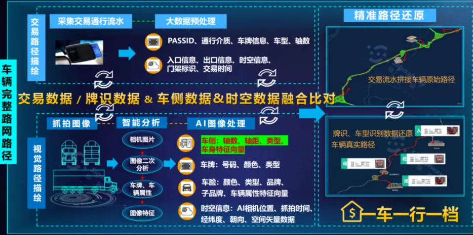 (1)充分利用車輛多維特征,精準還原通行路徑,構建一車一行一檔記錄,實現(xiàn)車輛“通行數據、計費數據、拆分數據”的路徑融合。