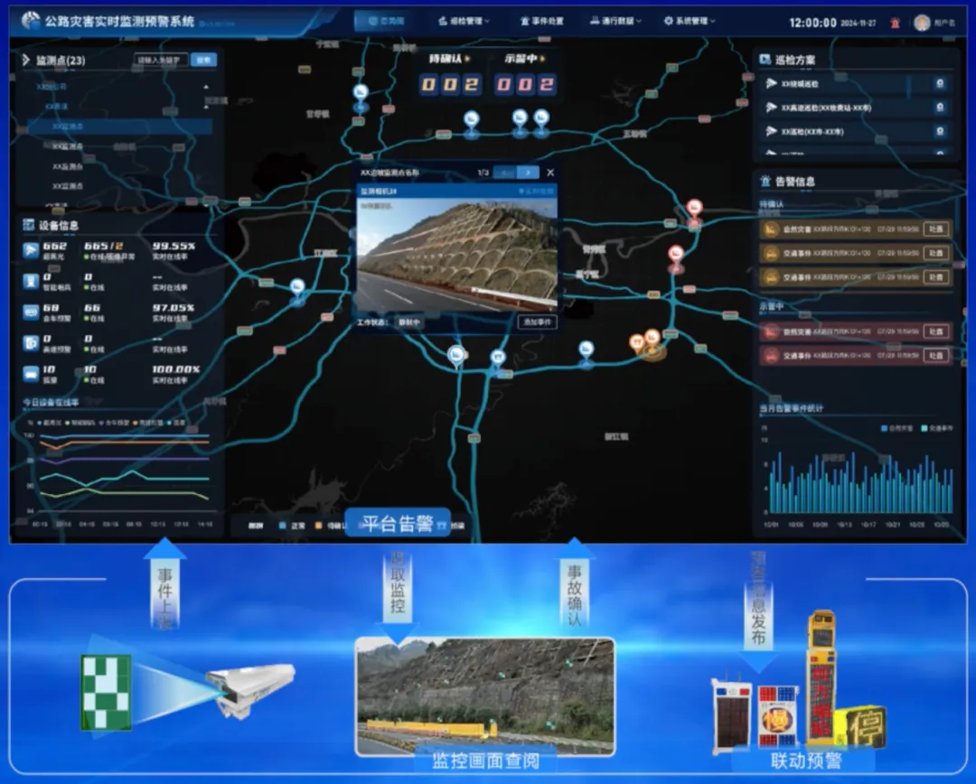 信路威新推出第一代“災(zāi)害(邊坡/橋梁)在線監(jiān)測(cè)及智能預(yù)警系統(tǒng)”,依托信路威視覺大模型,實(shí)現(xiàn)全天候精準(zhǔn)監(jiān)測(cè),實(shí)時(shí)感知路面異常。當(dāng)系統(tǒng)檢測(cè)到異常時(shí),立即觸發(fā)“AI監(jiān)控報(bào)警-云端確認(rèn)與處置-現(xiàn)場(chǎng)聲光示警聯(lián)動(dòng)”三級(jí)響應(yīng)機(jī)制,快速提醒監(jiān)控人員處理,并聯(lián)動(dòng)現(xiàn)場(chǎng)示警設(shè)備。通過開啟紅藍(lán)閃爍燈、高亮LED屏及語音播報(bào)等多模態(tài)預(yù)警手段,主動(dòng)引導(dǎo)后續(xù)車輛,提示前方道路異常,有效降低道路安全事故發(fā)生概率。事件處置完成后,系統(tǒng)會(huì)自動(dòng)生成詳細(xì)報(bào)告。系統(tǒng)廣泛適用于山區(qū)公路、高速公路的高危邊坡及橋梁的安全監(jiān)測(cè)。