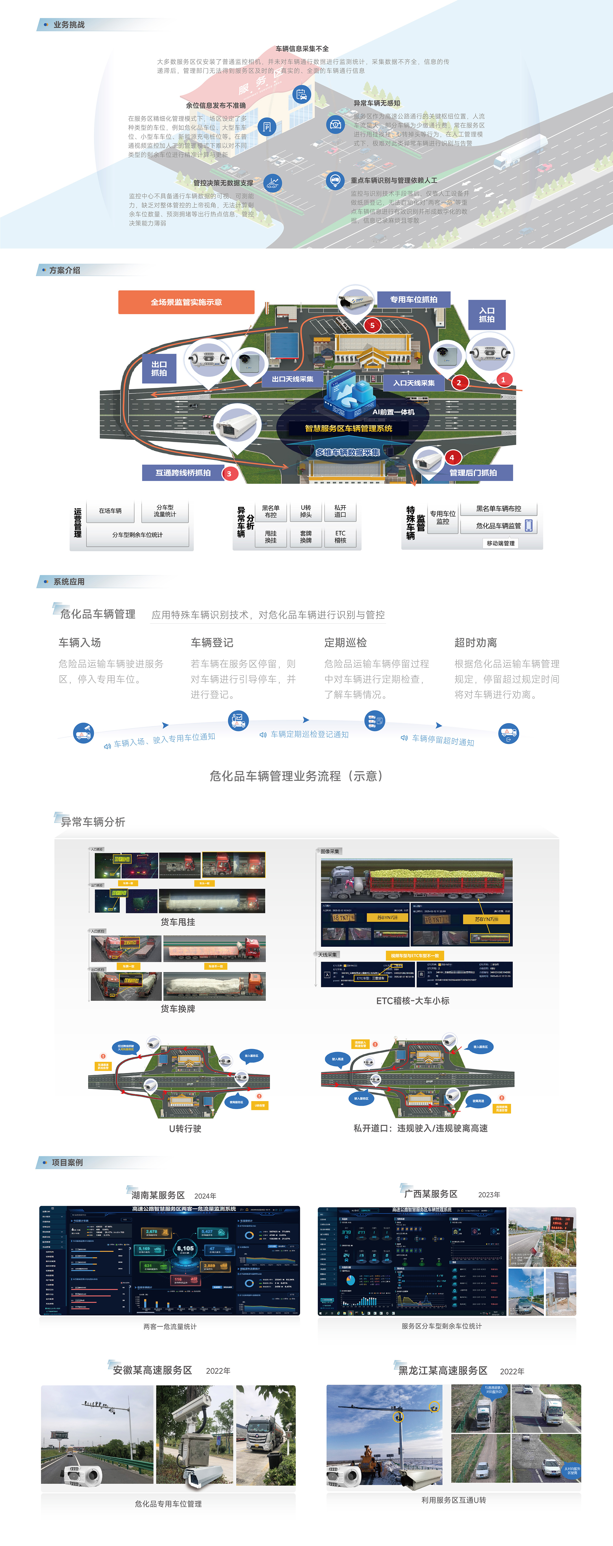 該方案基于智能視頻分析技術(shù),整合服務(wù)區(qū)內(nèi)各個關(guān)鍵出入通道及重點區(qū)域的視頻識別數(shù)據(jù),實現(xiàn)對場區(qū)內(nèi)車輛通行狀態(tài)的動態(tài)監(jiān)控、特殊車輛的安全監(jiān)管以及異常車輛行為的智能檢測,提供全方位的智能化車輛管理服務(wù),助力智慧服務(wù)區(qū)安全、高效運營。